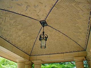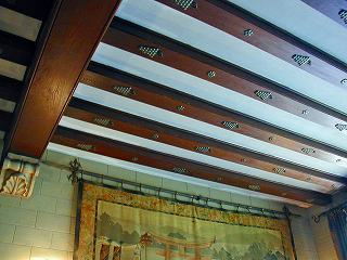 車寄せの高い天井、竹を組んだ網代模様が