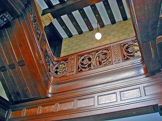 階段の柱、手すりはチーク材を使いデザインは