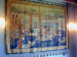 壁に掛かるタペストリーは安芸の宮島厳島神社・赤鳥居。