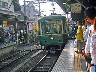 そして、100年余幾多の変遷を経て今日まで走り続けている、藤沢から鎌倉まで全長10km、時間にして34分間で、民家の軒先、植え込みをすれすれに狭い間を縫うように走る、親しみやすい電車だ。 |