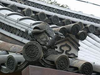 特に注目されるのは屋根両すみの留蓋瓦(とめぶたがわら)として立つ阿、吽を対にした亀像瓦です。冷泉家が御所の北にあることから、玄武神の亀蛇に基づいたものと思われます。 |